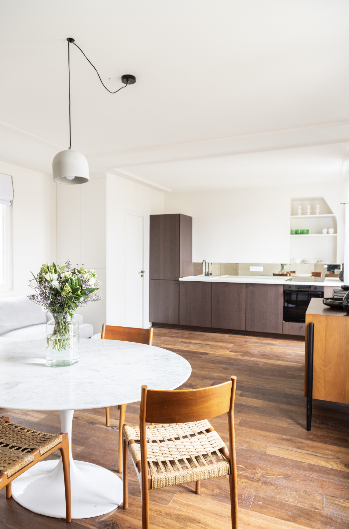 La pièce de vie principale s’articule autour d’une cuisine esthétique, fonctionnelle et légère visuellement. L’espace, inondé de lumière naturelle, s’ouvre sur un salon et une salle à manger qui dialoguent dans une même continuité, mettant en valeur un parquet en chêne massif teinté dans la masse. Cet aménagement permet de créer une pièce de vie continue et spacieuse, où chaque zone est définie avec équilibre et clarté.